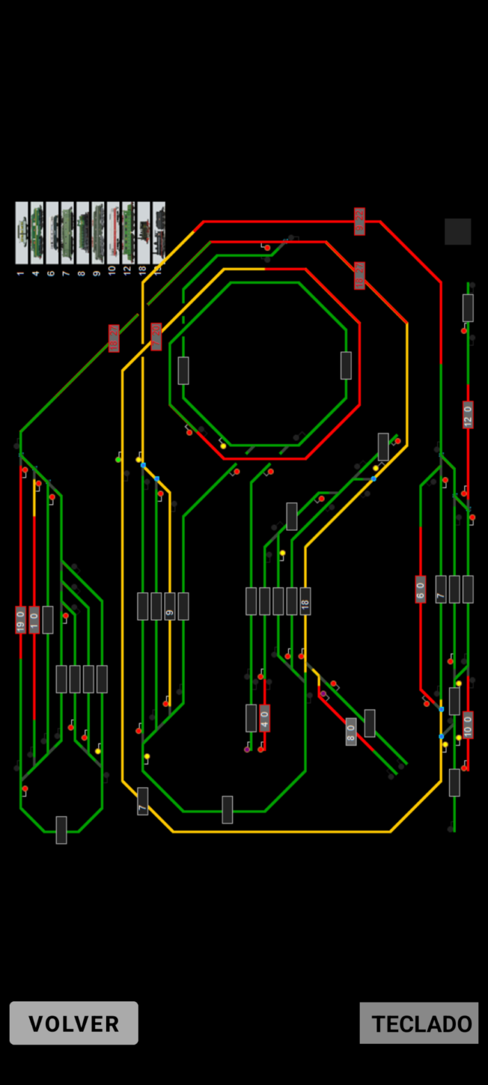 Figura 12. TCO. Es la red de vías representada en la pantalla del Ordenador. Los diferentes colores representan distintos estados de la vía: libre (verde), ocupada (rojo), bloqueada (amarillo), reservada (morado). Cada circulación se indica por su Número de Tren y junto a él su velocidad. Los recuadros solo con el Número de Tren indican cantones bloqueados por el tren o su itinerario. Solo se hacen visibles las señales luminosas del sentido de la marcha del tren; al invertirlo, serán visibles las del sentido contrario. Los desvíos enclavados tienen un punto azul en el corazón del desvío hasta que sean liberados.